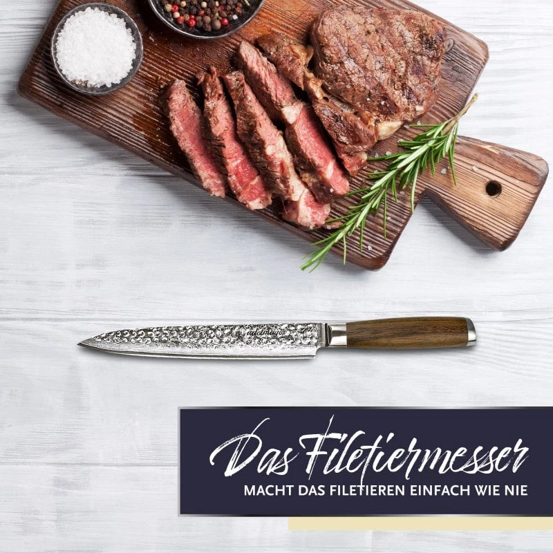Fischers Fritz filetiert mit dem Filetiermesser fleißig Fische und Fleisch in feine Filets. Gar nicht so einfach, unser Zungenbrecher, oder? Viel einfacher ist da das Filetieren von Fisch und Fleisch mit unserem adelmayer® Damast Filetiermesser. Dank der extra scharfen und dünnen Klinge gleitet das Messer mit Leichtigkeit durch die verschiedenen Lebensmittel und macht das Filetieren so einfach wie nie zuvor.