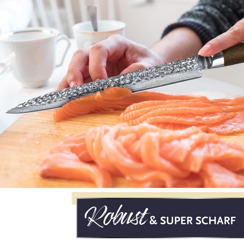 Mach dich bereit, um mit diesem feinen Degen in die Kochschlacht zu ziehen. Wir sprechen von unserem adelmayer® Damast Filetiermesser, das es dir mit seiner dünnen und superscharfen Klinge ermöglicht, besonders elegante Filetierduelle zu fechten und als Belohnung das kostbare Filetstück herauszulösen.
