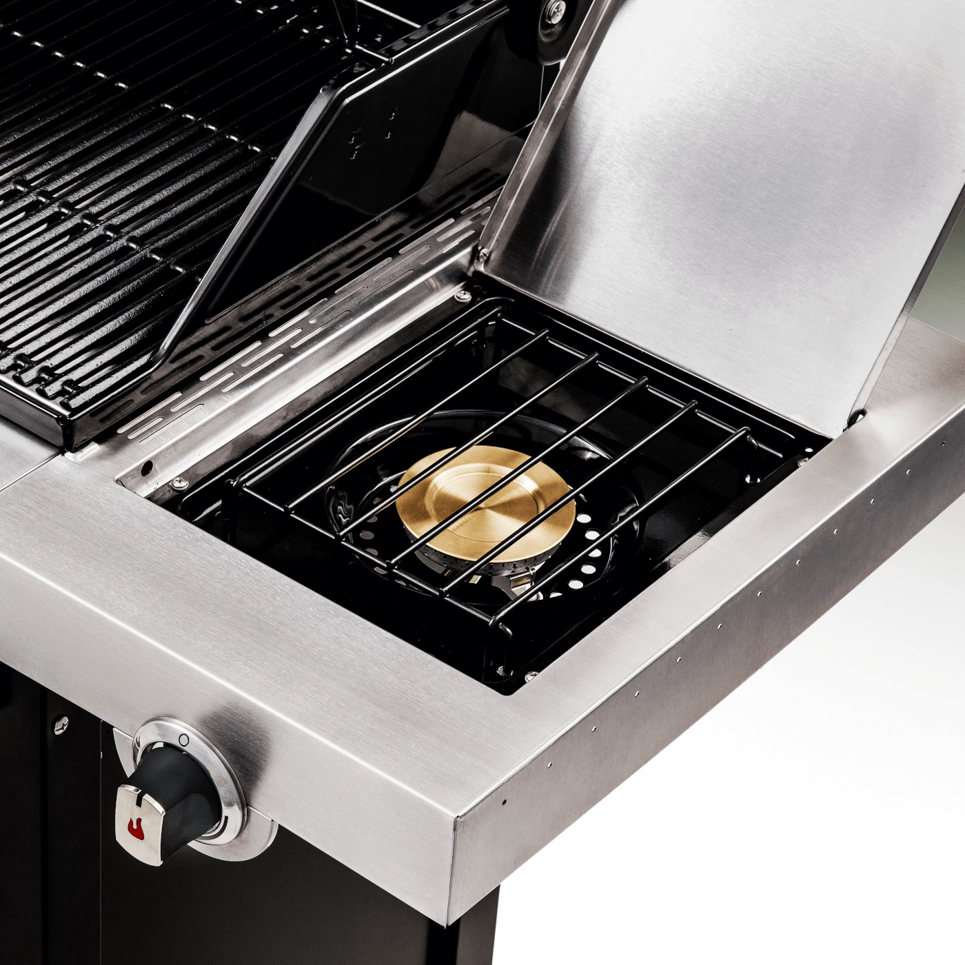 Ob am Wochenende oder spontan nach einem langen Arbeitstag: mit dem Professional 3 Brenner meisterst du jede Situation. Damit nicht genug: der eingebaute Seitenbrenner bietet eine zusätzliche Vorbereitungs- und Grillfläche. Die drei nach oben gerichteten Edelstahlbrenner mit einem Edelstahlschutzschild sorgen für einen höheren Wirkungsgrad, während die verbesserte Brennkammer aus einem Stück die Hitze perfekt umschließt. Die zwei, großen Stahltüren verdecken den Tank und schaffen zusätzlichen Stauraum. Starte den Gasgrill mit der SureFire® elektronischen Zündung mit nur einem Knopfdruck. Sobald der Grill an ist, heizt unsere Infrarot-Technologie schneller, heißer und gleichmäßiger. Hitze wird direkt an das Grillgut geleitet, damit das Fleisch schön saftig bleibt. Die Emitterplatten sind leicht zu reinigen und sogar spülmaschinenfest. Gusseisen Grillroste direkt über den Emitteröffnungen sorgen für perfekte Grillstreifen. Die leicht zu lesende Temperaturanzeige auf dem Deckel ermöglicht es dir das perfekte Steak zu grillen. Vier Rollen sorgen für mehr Mobilität und erlauben es den Gas Grill leicht zu verstauen. Der 3 Brenner eignet sich perfekt für 4-6 Personen.