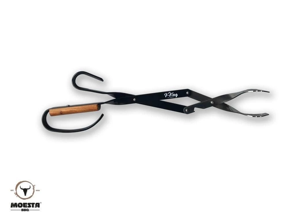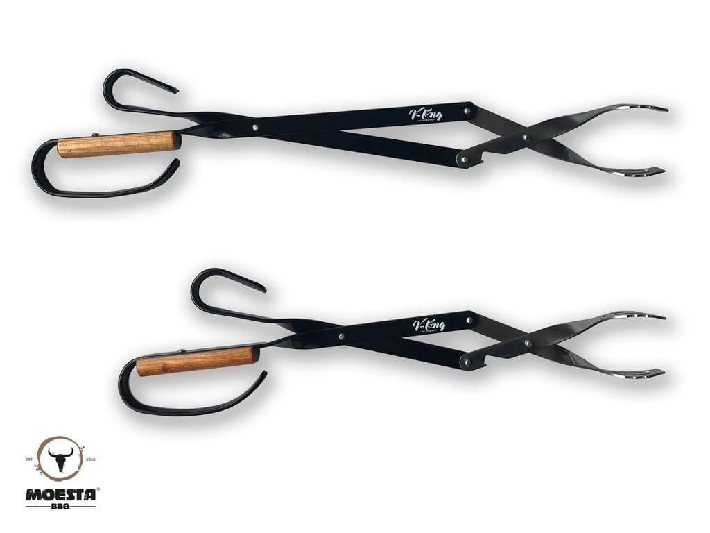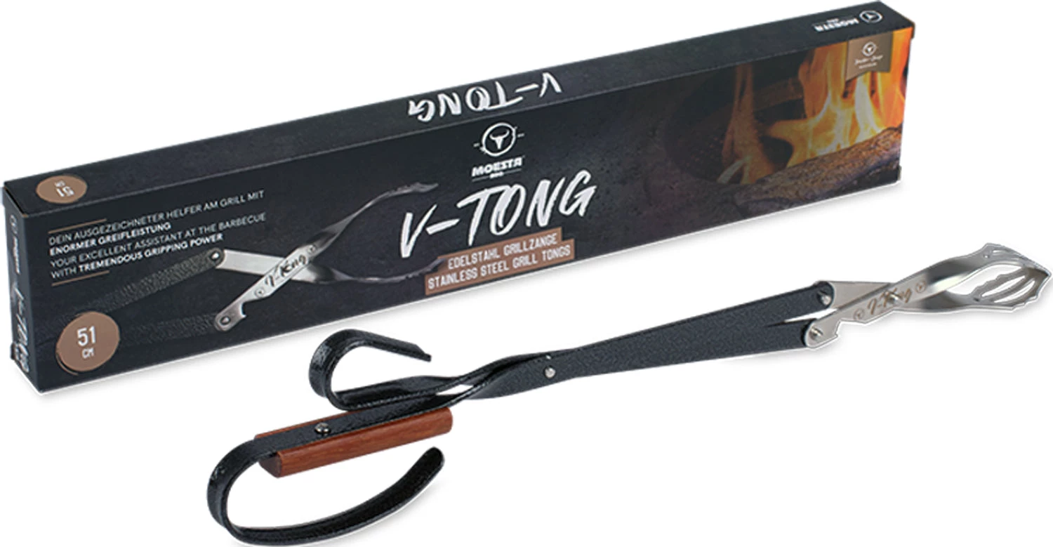 Grillzange aus Edelstahl und pulverbeschichtetem Aluminium mit Hartholzgriff und V-Tong Logo.