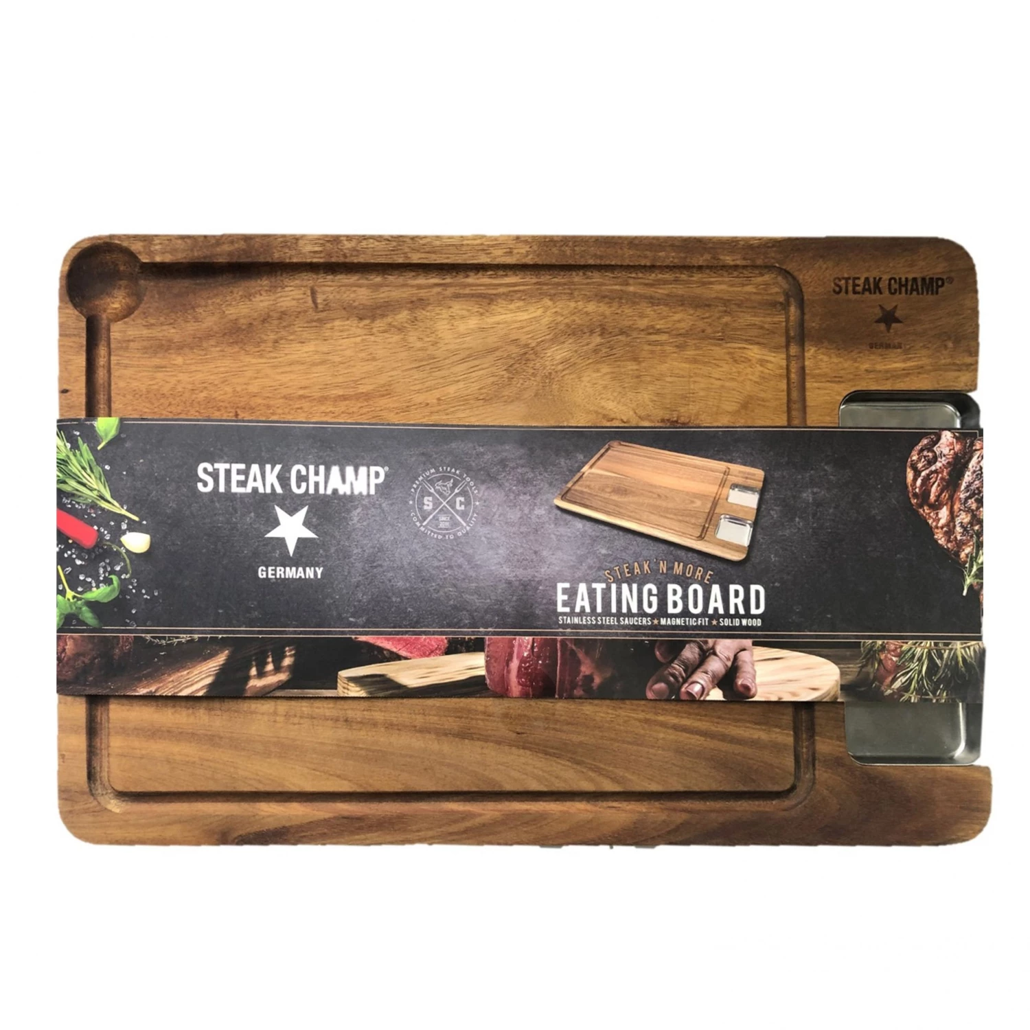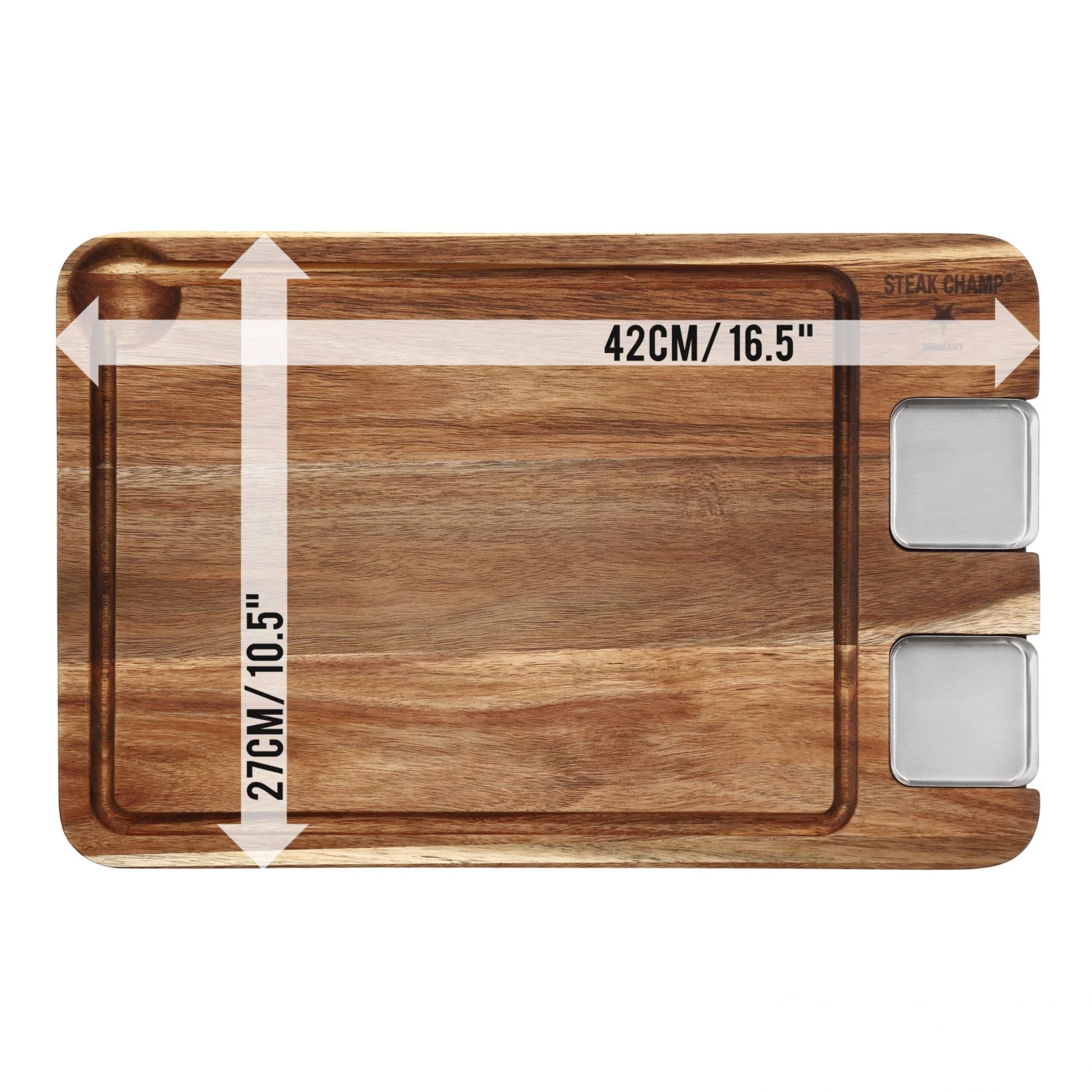 Für ein stilvolles Geniessen bei Tisch, egal ob Porterhouse, Ribeye oder Burger. Dies edle Akazienholzbrett ist mit lebensmittelechtem Pflanzenöl hauchdünn beschichtet. Akazienholz hat nicht nur eine natürliche Widerstandsfähigkeit gegen Bakterien, sondern hält auch Deine Steakmesser länger scharf. Der Saftrille haben wir ein kleines Gefällle gegeben, so dass der Fleischsaft sauber und ordentlich ablaufen kann. Deine beiden Lieblingssaucen oder Gewürzmischungen finden Ihren Platz in den Saucieren aus Edelstahl, die von einem Magneten an ihrem Platz gehalten werden. Die natürliche Maserung der Akazie variiert und erzeugt einen schönen Kontrast. So ist jedes Brett ein Einzelstück.