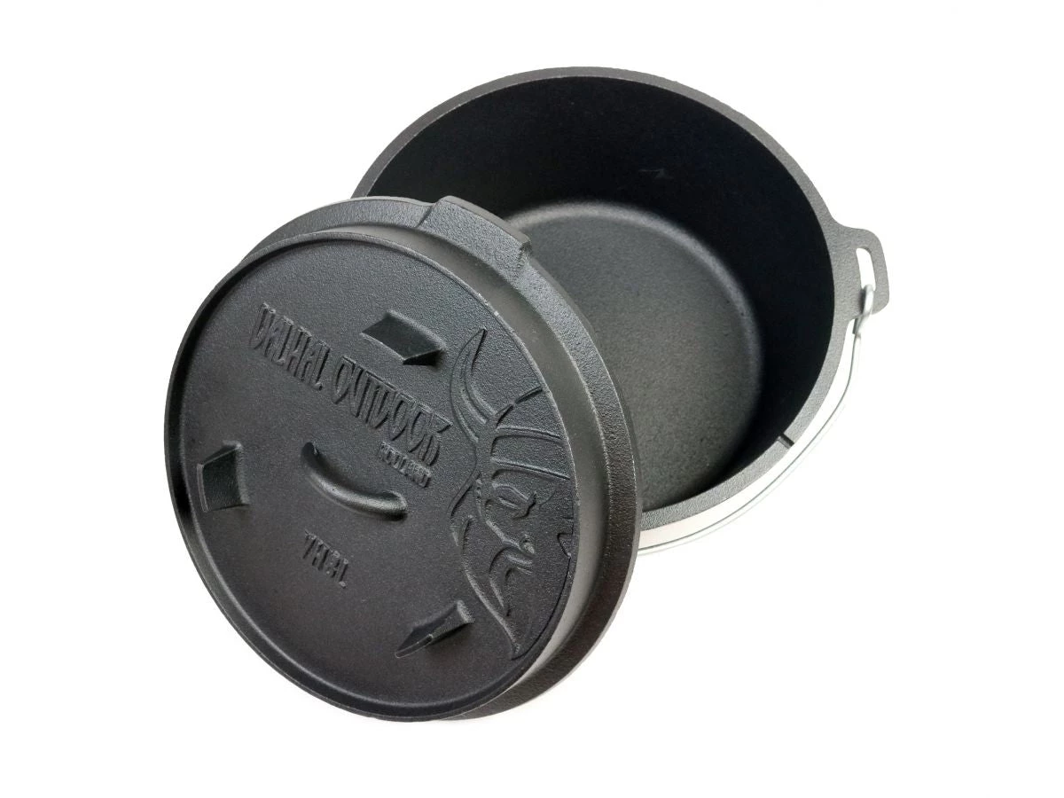 Dank der Füße auf dem Deckel können Sie ihn umgekehrt direkt auf die Wärmequelle stellen, ohne die Hitze zu „würgen“. Sie können den Deckel als Pfanne verwenden. Dank der erhöhten Kante können Sie Kohle auf den Deckel legen und so eine Ofenfunktion im Dutch Oven erzeugen.